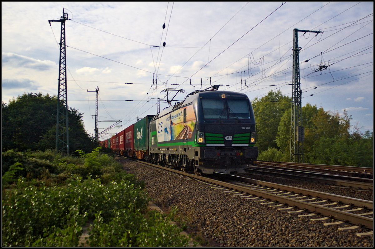 Die bei RTB Cargo eingesetzte 193 249-0 fuhr am 30.08.2017 solo durch die Berliner Wuhlheide