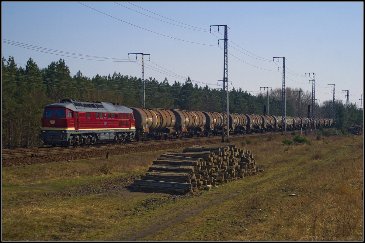 155 239-7 der Erfurter Bahnservice (EBS) war leider im Gegenlicht mit Kesselwagen am 06.04.2018 in der Berliner Wuhlheide unterwegs