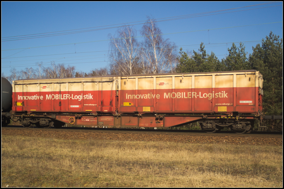 Vierachsiger Drehgestell-Flachwagen mit Rungen der Gattung Rns-z der Rail Cargo Wagon aus Österreich. Geladen hatte der Wagen Holzlatten. Am 08.09.2018 lief der Wagen in einem gemischten Güterzug mit, der gerade die Elbbrücke in Magdeburg verlassen hatte (31 RIV 81 A-RCW 3504 252-7 Rns-z).