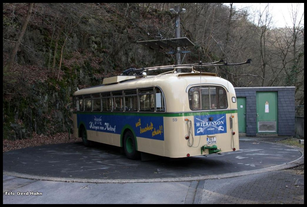 In Solingen Burg gibt es die einzige Bus Drehscheibe in Deutschland. Die fehlende Wendemöglichkeit für die alten Busse machte diese Konstruktion erforderlich. Sie wird heute noch wie hier am 12.5.2015 von dem Oldtimer Bus Nr. 59 regelmäßig bei seinen Sondereinsätzen genutzt. Hier ist der Drehvorgang gerade beendet und der Bus steht wieder abfahrbereit in Richtung Solingen Stadtmitte.