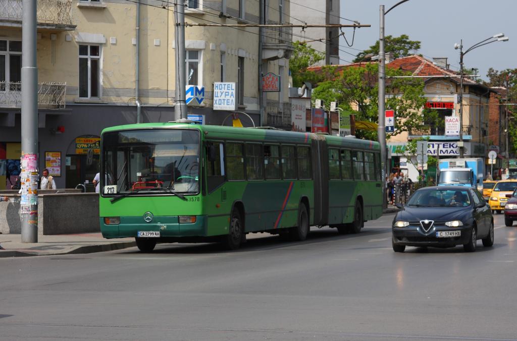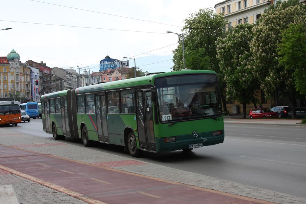 Dieser Mercedes Benz Gliederbus war am 6.5.2013 in der bulgarischen Hauptstadt Sofia auf der Linie 213 im Einsatz zu sehen.