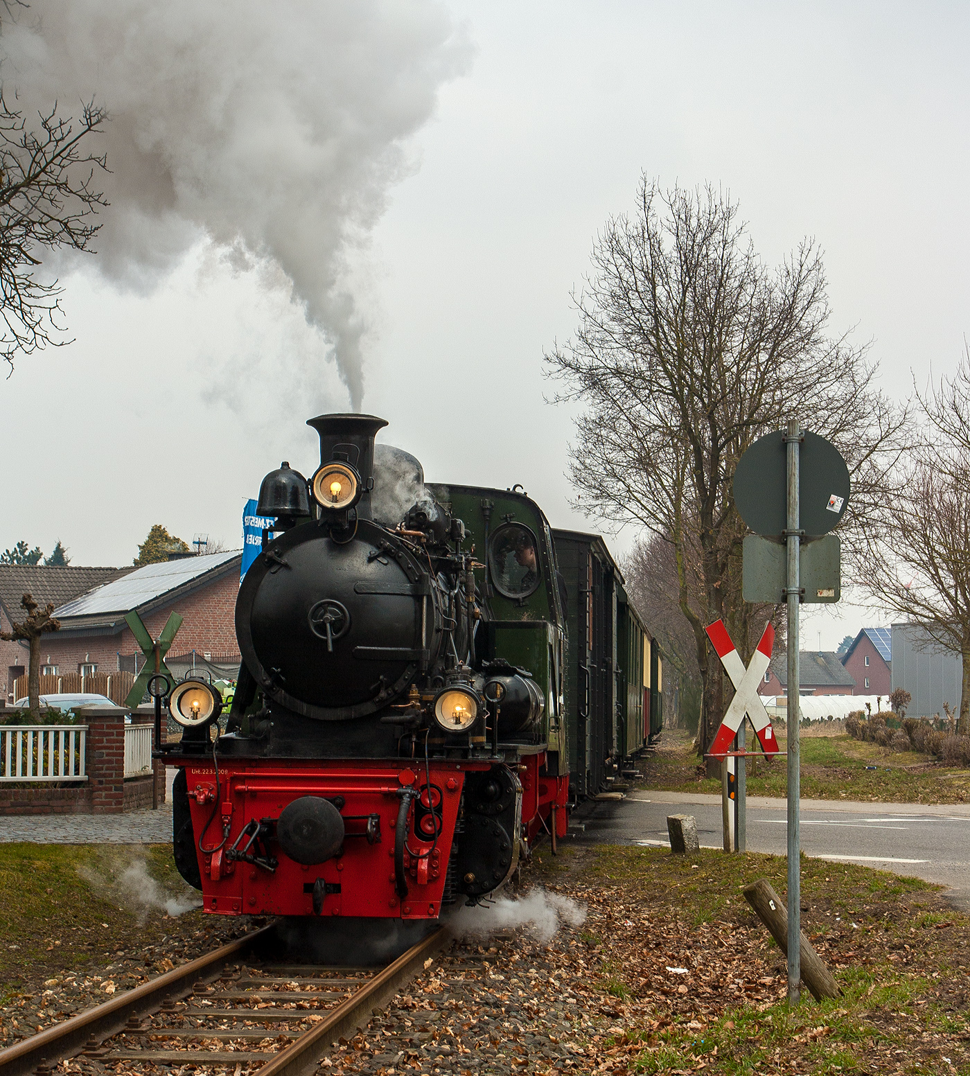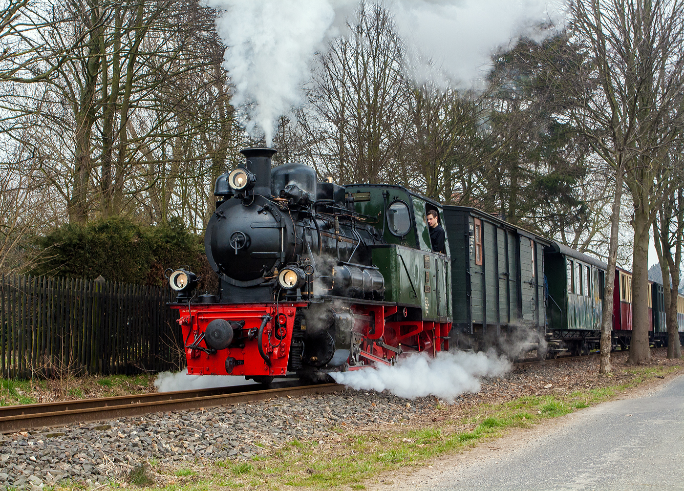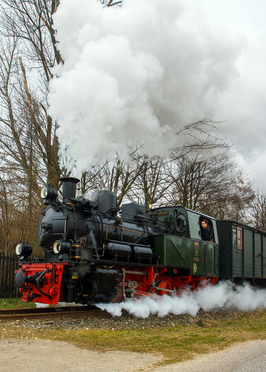 Die Jung Schmalspur Dampflok 20 "Haspe" der Selfkantbahn bzw. Interessengemeinschaft Historischer Schienenverkehr e. V. (IHS) zieht ihren Personenzug am 31 März 2013 bei Birgden in Richtung Gillrath.