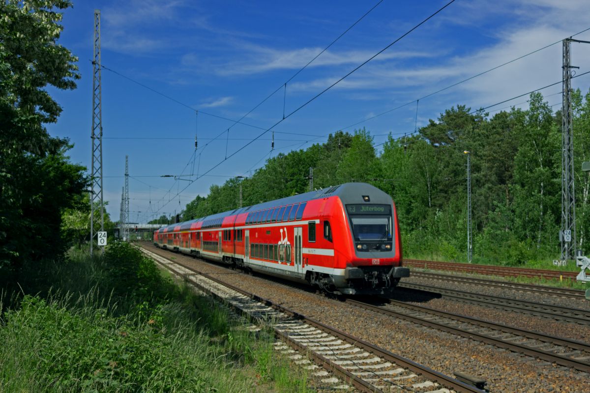 Auf dem Weg nach Jüterbog fährt ein von 112 112 geschobener RE3 in Ludwigsfelde ein.
