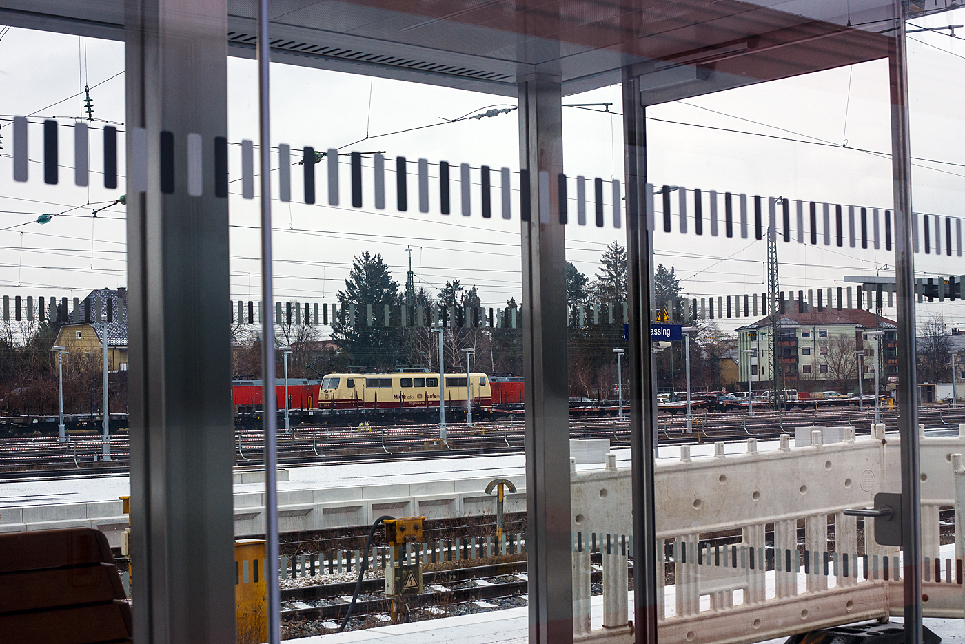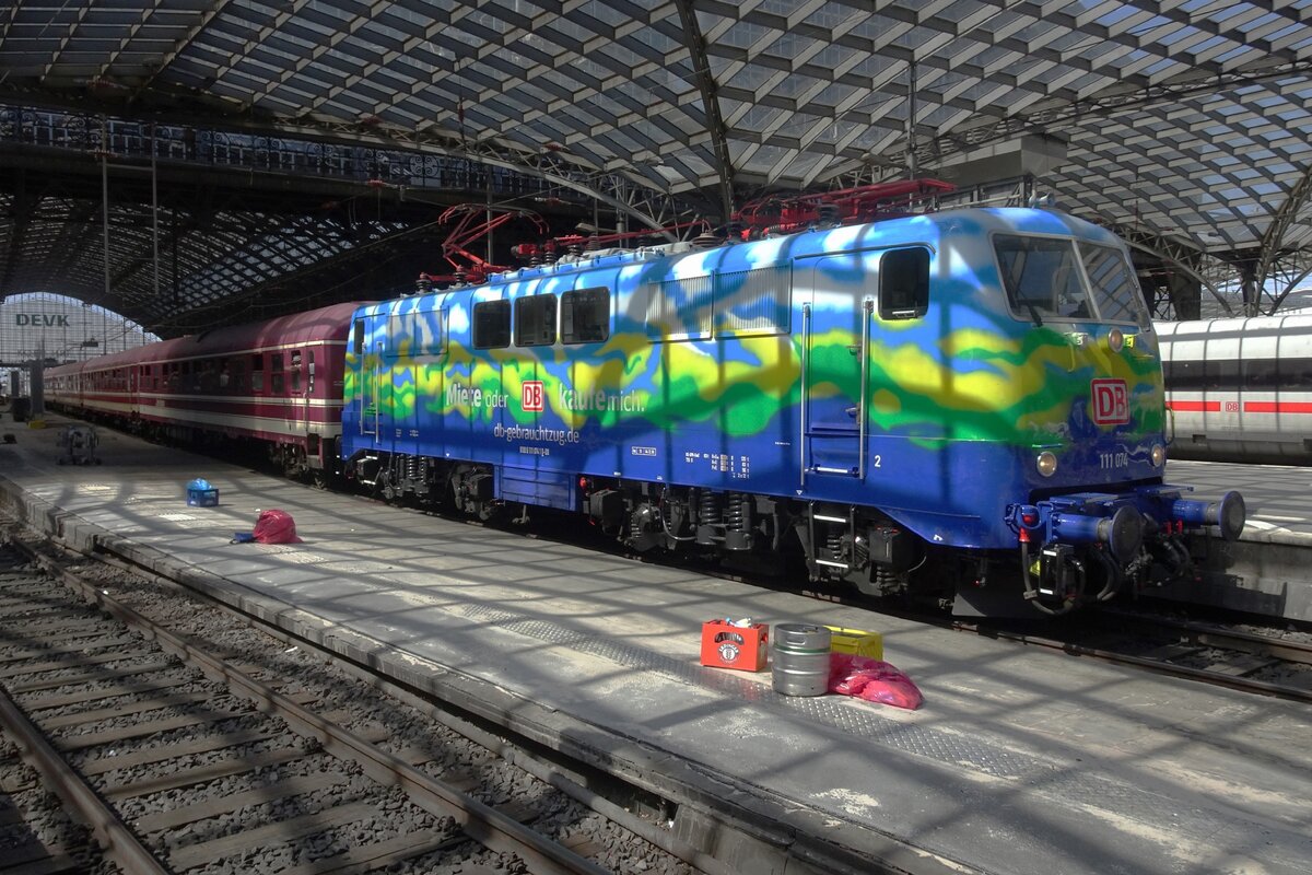 E-Lok 111 222-6, von railadventure, steht am Ende eines Bahnsteiges im Hbf. von München abgestellt. 01.05.2025