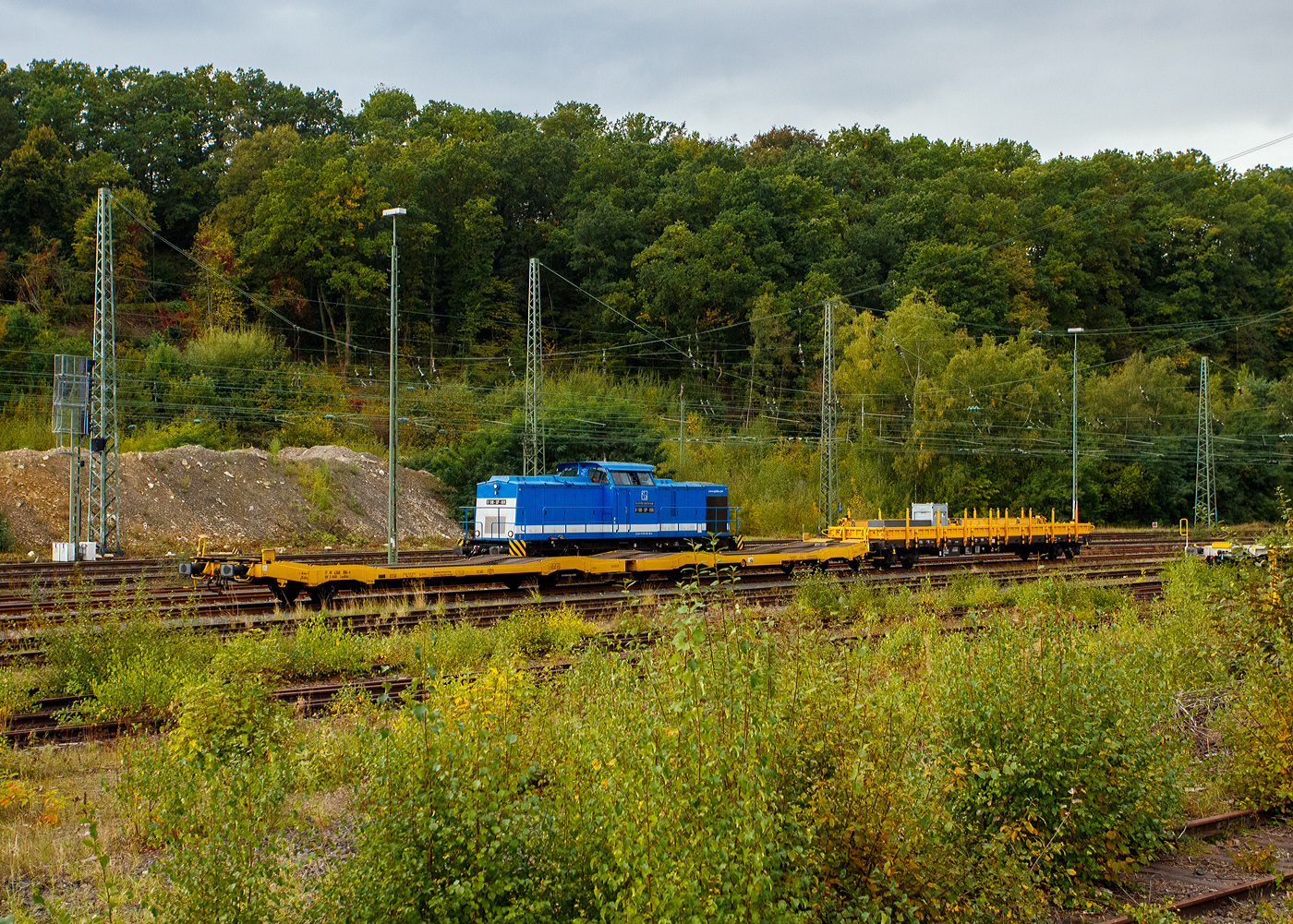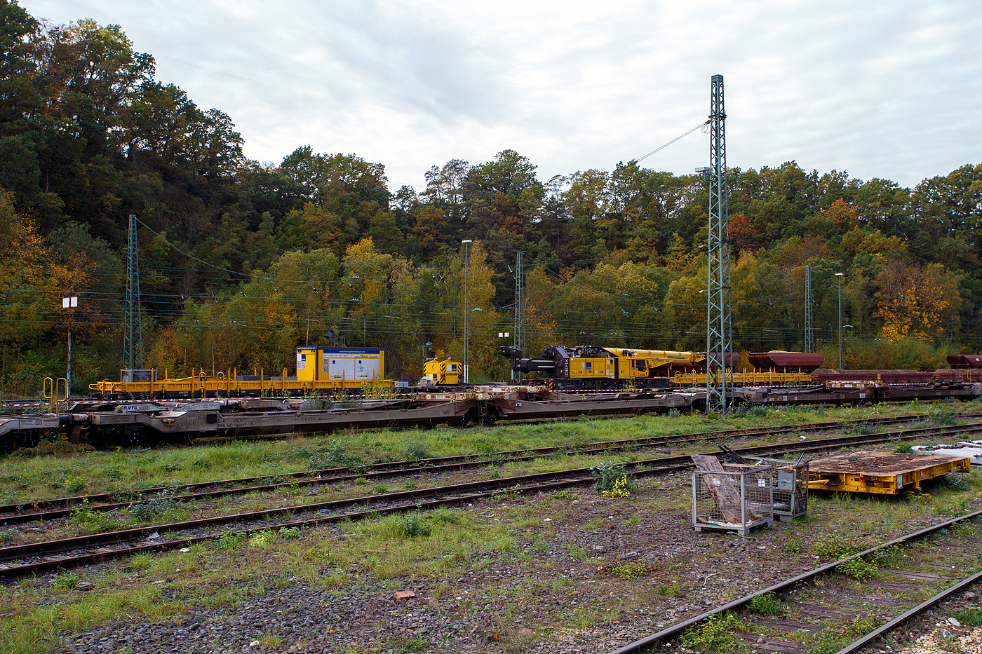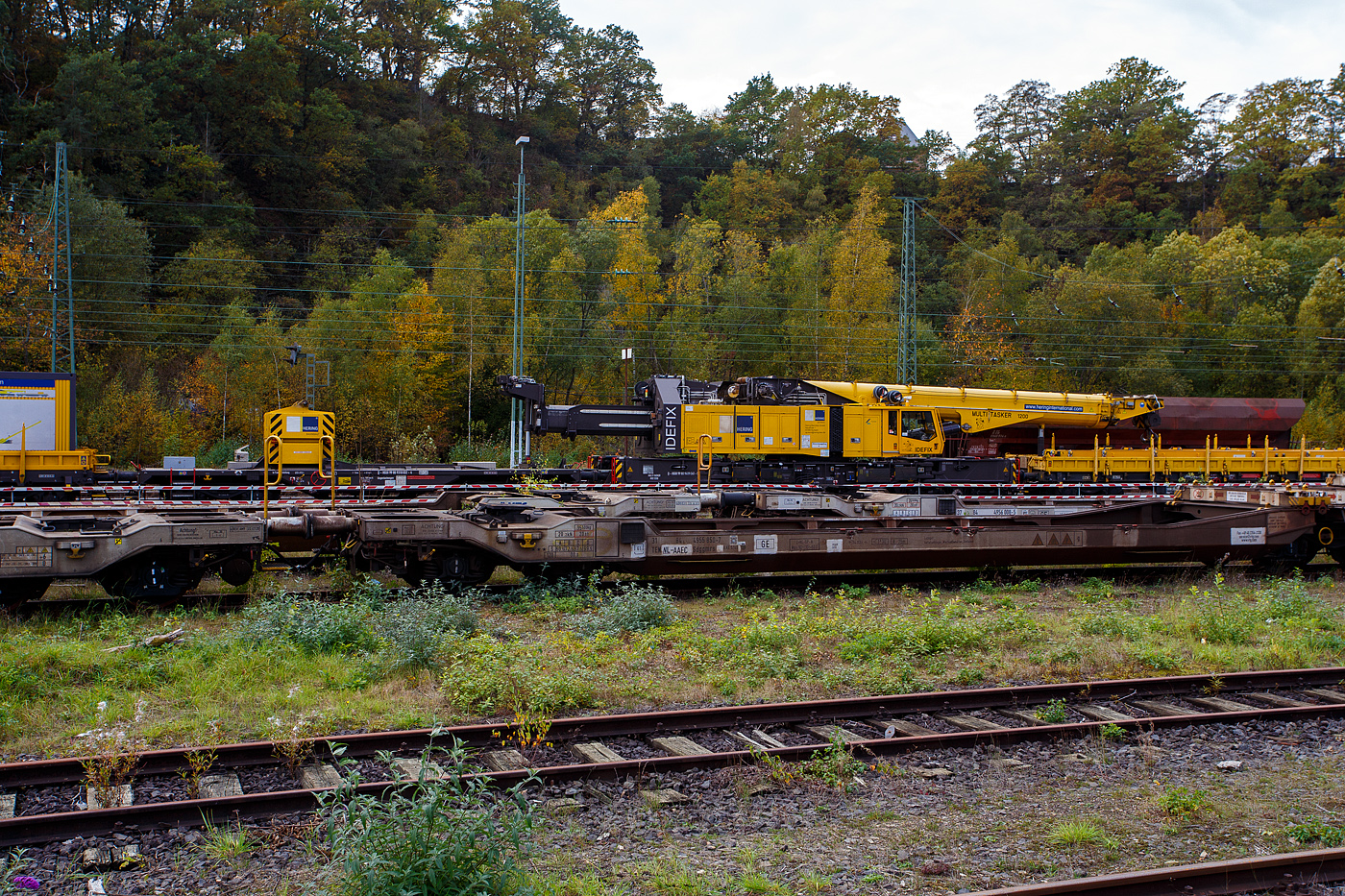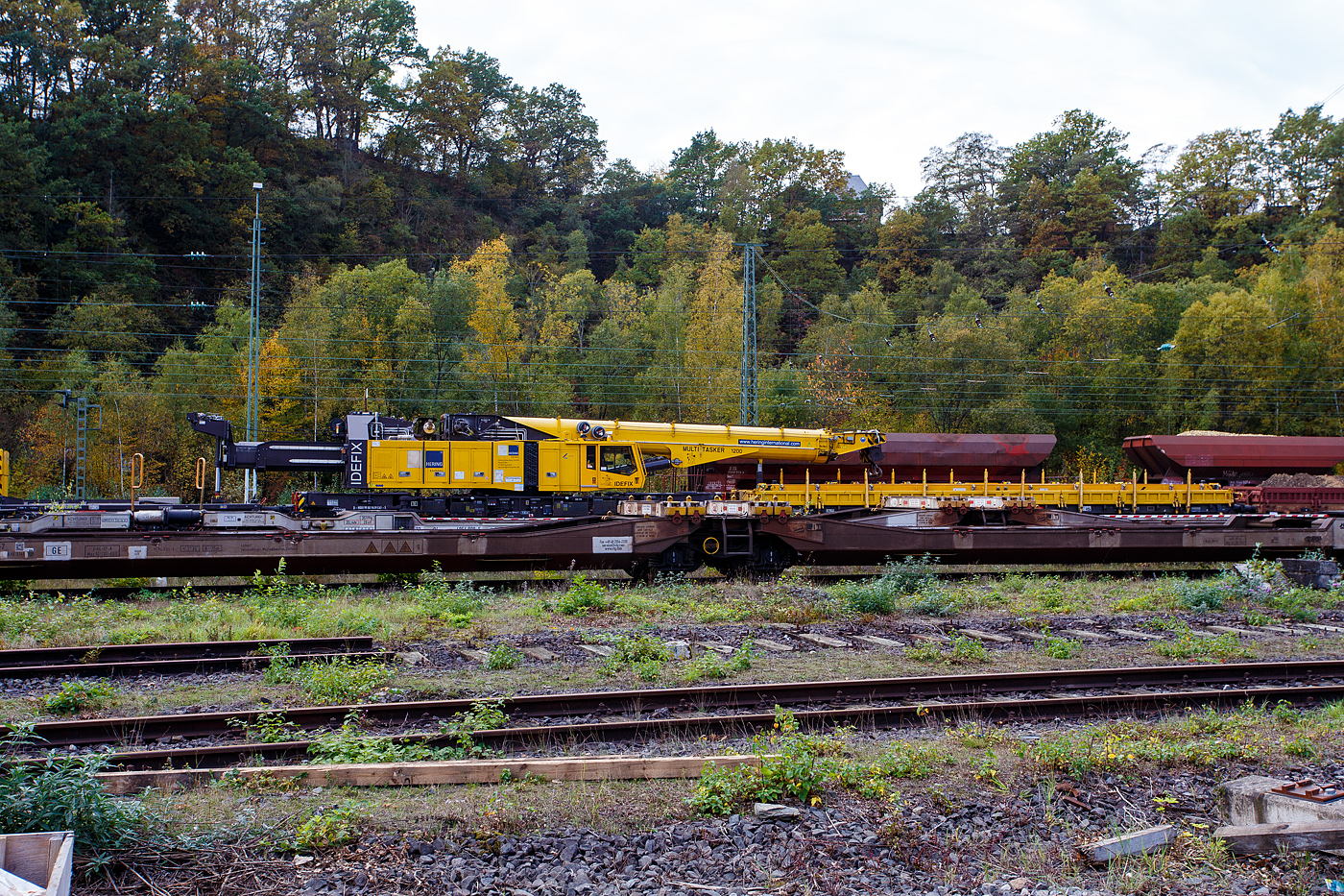 Nun im Einsatz der 125 t KIROW Gleisbauschienenkran KIROW Multi Tasker KRC 810 T (mit Schwerlastausrüstung), Schweres Nebenfahrzeug Nr. D-HGUI 99 80 9419 024-1, ex 97 82 53 513 19-3, der HERING Bahnbau GmbH (Burbach) ist am 29 September 2025 im Betzdorf/Sieg.