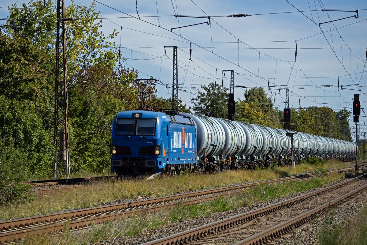 192 017, eine Lok aus der Siemens-Produktreihe Smartron durchfährt am 13.10.2020 Saarmund.
