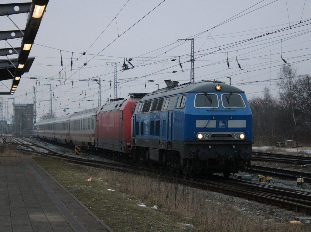 218 454 mit IC 2262(AH-WBI)bei der Einfahrt im Rostocker Hbf.23.01.2026