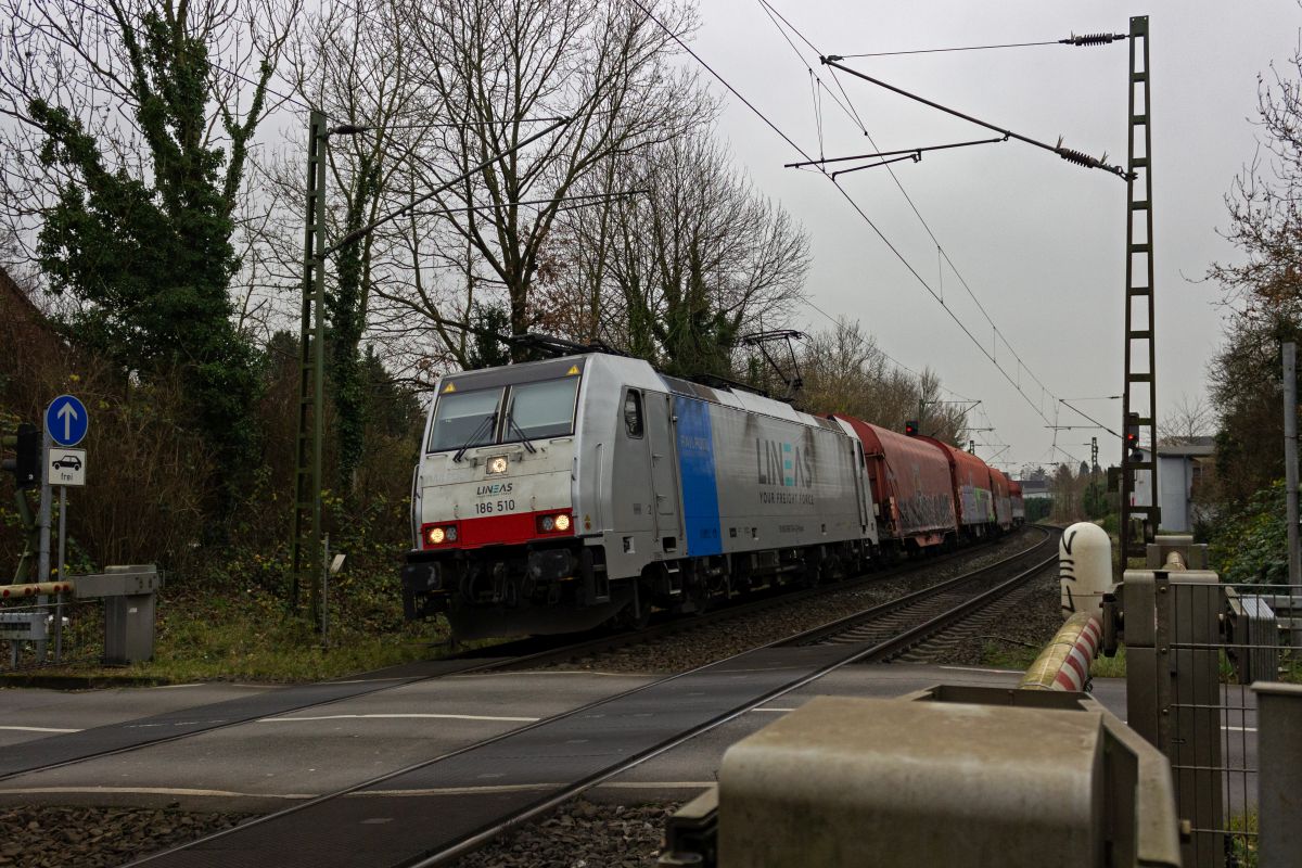 193 130 gehört zu einer großen Serie Vectron-Lokomotiven für Railpool, die seit 2022 ausgeliefert werden. Im Einsatz für TX Logistic ist die Lok hier mit einem Trailerzug in Saarmund unterwegs.