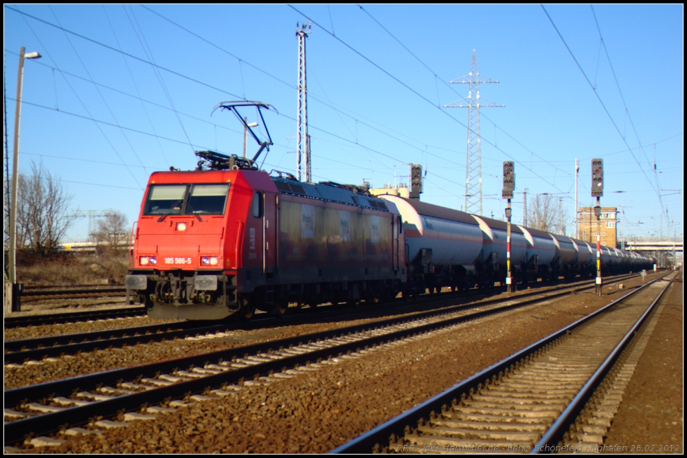 DB Schenker 155 192-8 mit einem gemischtem Güterzug am 26.02.2012 in Berlin Schönefeld-Flughafen.