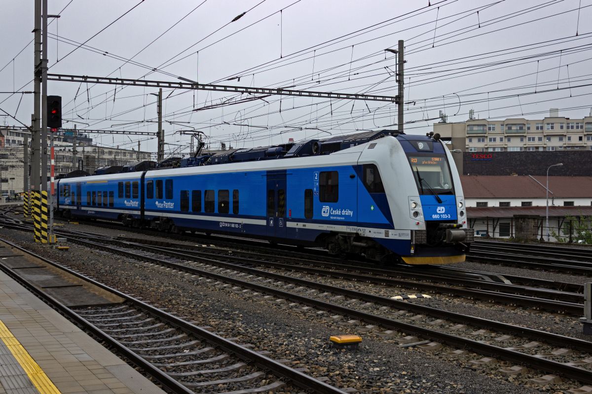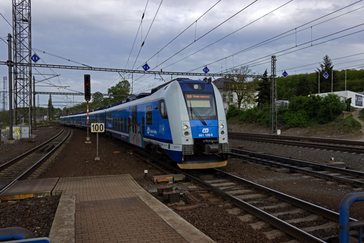 In der Abstellanlage des Bahnhofes Praha-Smíchov warten zwei Rýchlik-Züge, die auf unterschiedlichen Wegen in Richtung Brno fahren werden auf ihre Abfahrtszeit: Der moderne InterPanter 660 110 als R865 nimmt auf der Linie R19 den Weg über Pardubice und Česká Třebová, während 362 167 mit R979 ab Kolín den etwas direkteren Weg über ´dár nad Sázavou zum Bahnhof Královo Pole am Stadtrand von Brno nimmt.