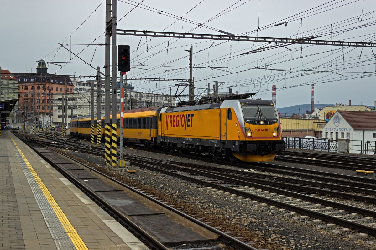 386 203 von RegioJet rangiert eine kurze Wagengarnitur auf den von der privaten Bahngesellschaft angemieteten Gleisen im ehemaligen Güterbahnhof Smíchov.