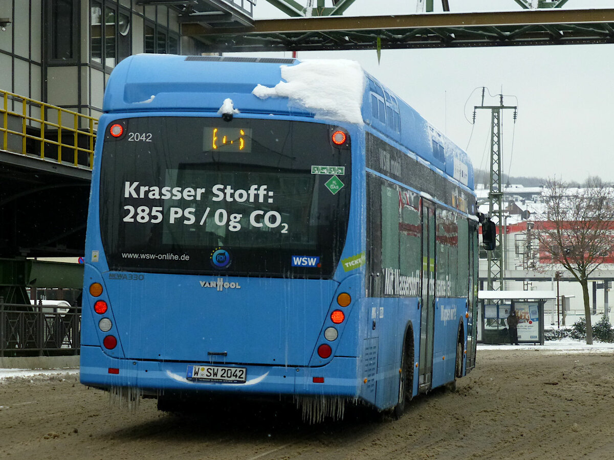 Dieser Wasserstoffbus von Van Hool ist im niederländischen Groningen bei Qbuzz im Einsatz. Die Firma gehört einem Tochterunternehmen der italienischen Staatsbahn Trenitalia, sodass deren Logo prominent auf dem Bus zu sehen ist.