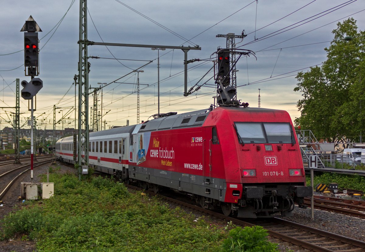 101 018 erreicht mit einem Intercity in Richtung Süden den Düsseldorfer Hauptbahnhof.