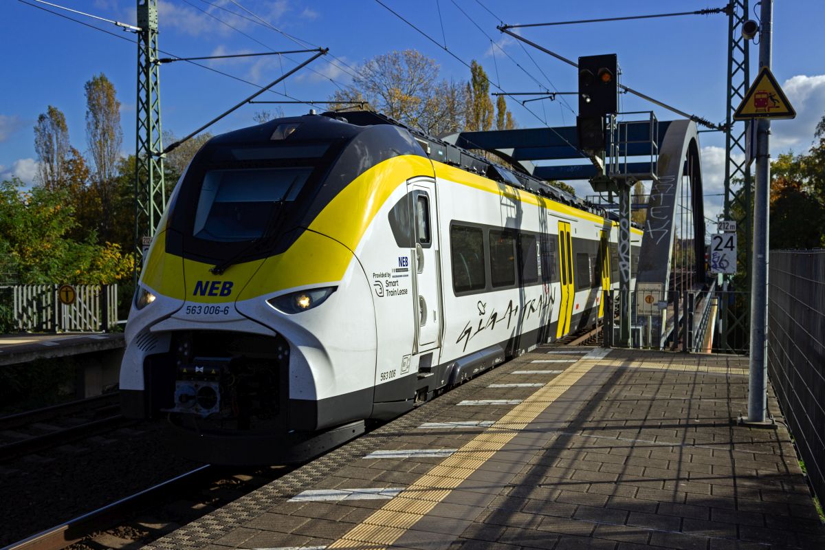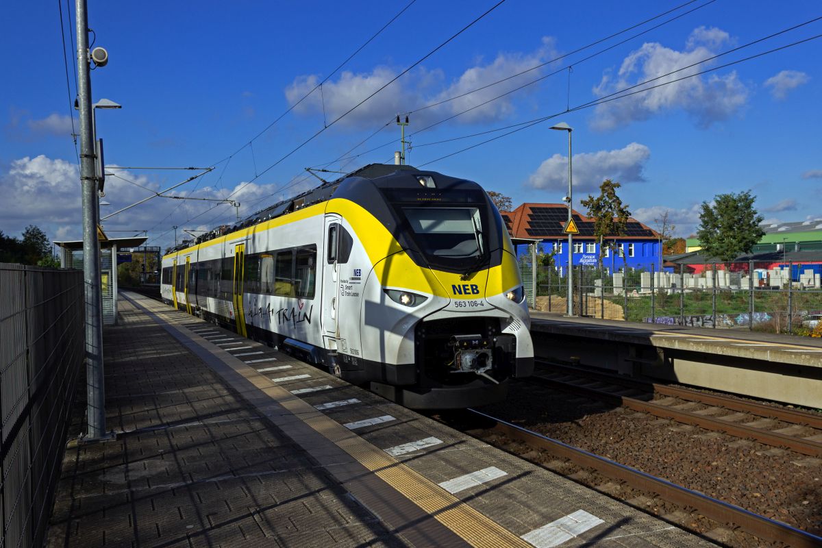 In der Nähe von Berlin ist eines der wenigen komplett kostenlosen Nahverkehrsangebote unterwegs. Von Erkner zum nahegelegenen Tesla-Werk pendelt ein von der Niederbarnimer Eisenbahn eingesetzter Triebzug als "Gigatrain". Am 23.10.24 war dies 563 006, der ursprünglich für Baden-Württemberg gebaut wurde, zunächst aber vom Hersteller Siemens an die NEB vermietet wurde.