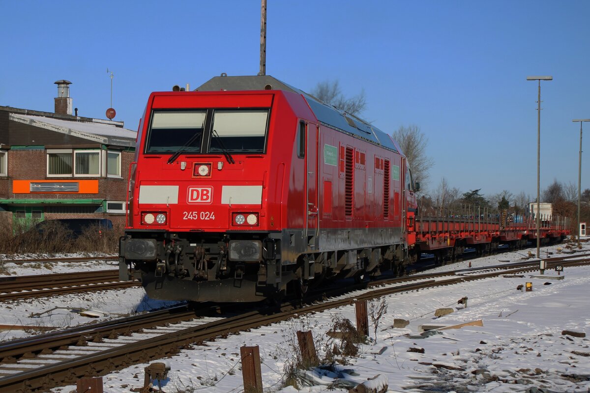 Vom hinter der Bahnübergang wurde am 14 Februar 2026 DBAZ 245 024 mit deren Sylt-Shuttle beim einfahren in Niebüll fotografiert.