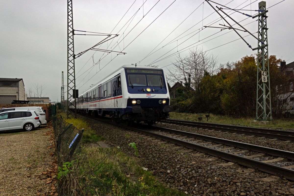 Mit der "normalen" National-Express-Ersatzgarnitur ist am 12. Februar 2021 der RE7 unterwegs, hier bei der Durchfahrt in Steinbeck, vorne die Lok 110 469 im National-Express-Design und mit Jobwerbung.
