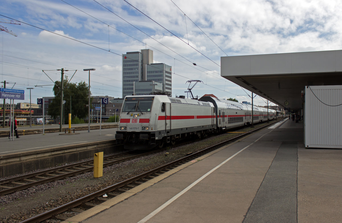 Auf der Fahrt nach Emden verlässt 146 570 mit einer Garnitur IC-Dosto den Hannoveraner Hauptbahnhof.