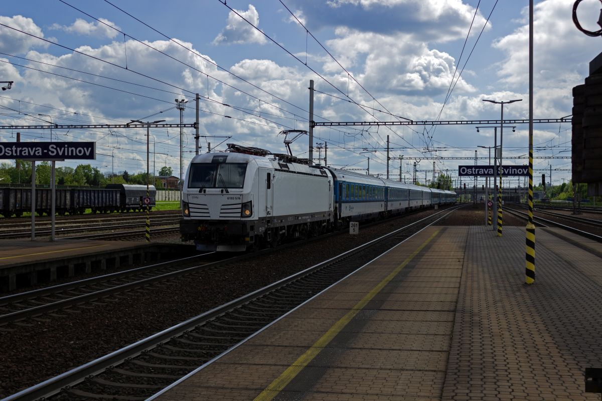 193 290 "Tedík" hat den um knapp 90 Minuten verspäteten EC 172 aus Budapest am Haken und wird auf der Fahrt in Richtung Hamburg nur kurz in Hole¨ovice zwischenhalten.