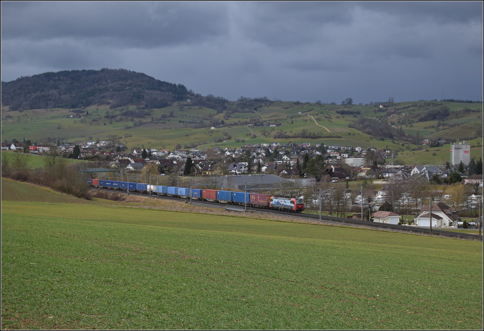 193 469 'Simplon' zieht für SBBCI Container den Bözberg hoch. Februar 2026.