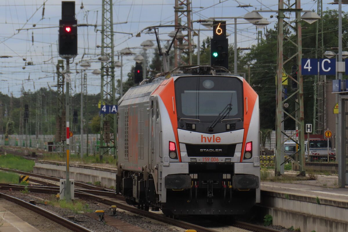 Die an die HHPI - Heavy Haul Power International GmbH (Erfurt) vermietete F=ma 20-02 bzw. 159 202- 1(90 80 2159 202-1 D-RCM), eine sechsachsige Stadler EURO DUAL der ELP - European Loc Pool AG (Frauenfeld/Schweiz), eingestellt in Deutschland durch die RCM Rail Care and Management GmbH (München), fährt am 24.11.2022 mit einem leeren Holzzug (Wagen der Gattung Sggmrrs der österreichischen Innofreight Speditions GmbH) durch den Hauptbahnhof Regensburg in Richtung Nürnberg.