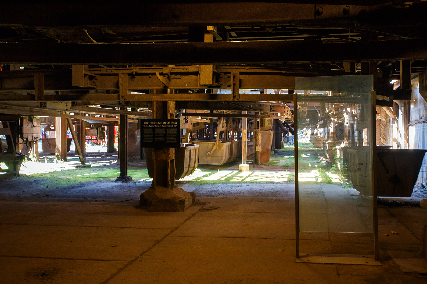 Auch eine Eisenbahn (Schwebebahn): Die Hängebahn der Völklinger Hütte am 01 Juli 2025, hier einer der selbstfahrenden Hängebahnwagen unter der Möllerhalle.