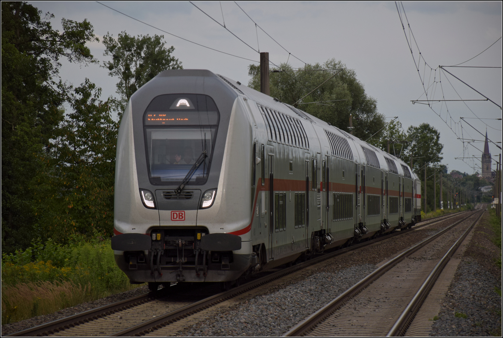 Mit dem Seehas auf Überholspur. Gleich mit zwei Zügen hätte ich den Radexpress überholen können. IC2  mit dem Wagenpark 2855 und 147 552 fährt nach Stuttgart. Dieser Zug fährt mittlerweile seit 7 Jahren nicht nach Zürich, wie ursprünglich vorgesehen. Im Hintergrund ist noch das Radolfzeller Münster zu sehen. Böhringen, August 2024.
