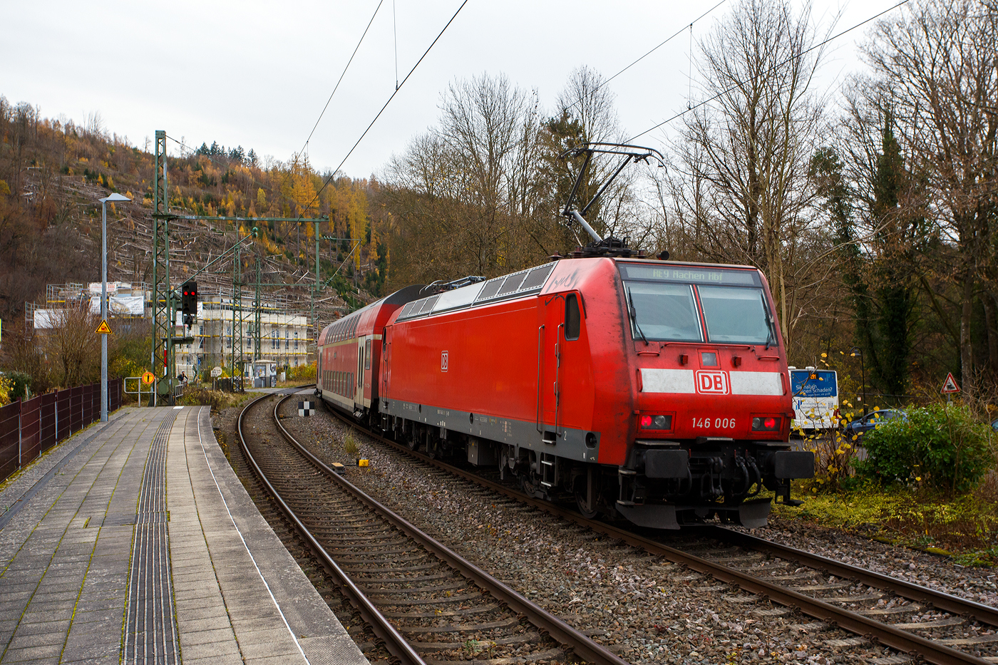 Am 16 Oktober 2025 gab es in Betzdorf/Sieg eine Weichenstörung, so hatte der gerade in den Bahnhof Kirchen/Sieg eingefahrene RE 9 - Rhein Sieg Express (RSX) Siegen - Köln – Aachen, geschoben von der 146 006-2 (91 80 6146 006-2 D-DB) der DB Regio NRW, länger Hp 0 und musste einen entgegenkommenden Güterzug abwarten. Nun darf auch der RE 9 Steuerwagen voraus weiterfahren.
