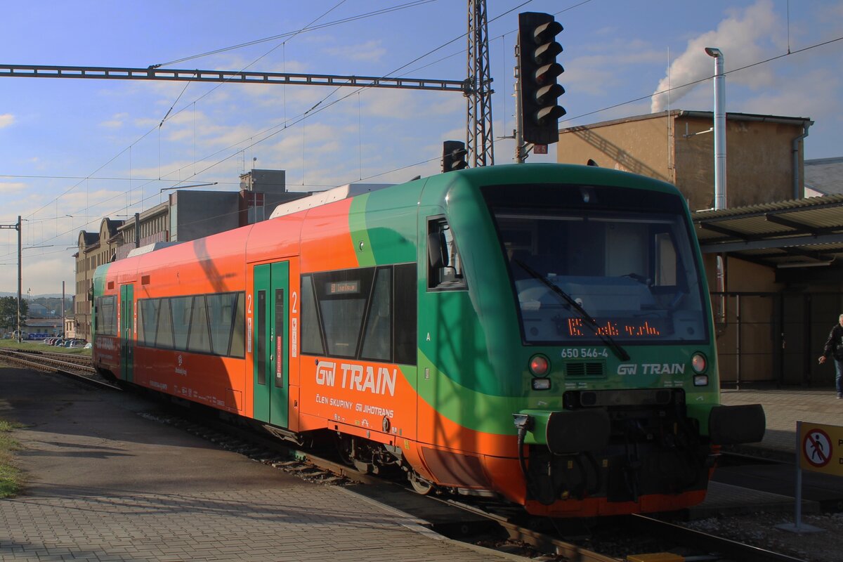 Der DUEWAG RegioSprinter 654 046-1 (95 80 0654 046-1 D-DLB) der GW Train Regio a.s., ex VT 45 der Die Länderbahn (noch über die DLB eingestellt) erreicht am 20.04.2023 den Bahnhof Becov nad Teplou(Petschau).