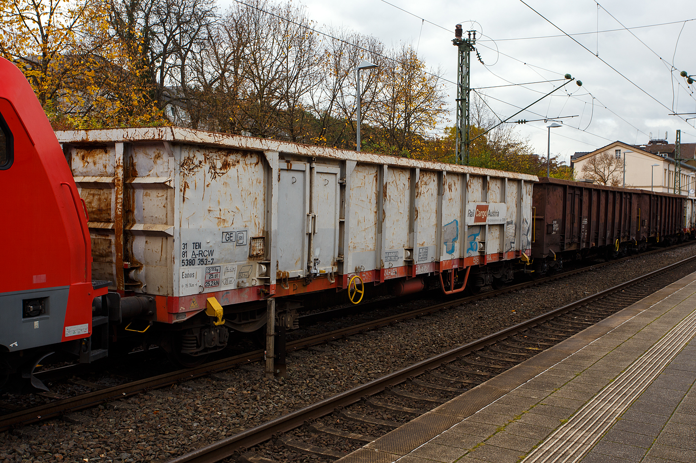 Vierachsiger offener Drehgestell-Güterwagen 31 80 5375 425-1, der Gattung Eanos-x 059, der DB Cargo AG am 31.03.2021 im Zugverband bei einer Zugdurchfahrt in Rudersdorf (Kr. Siegen).