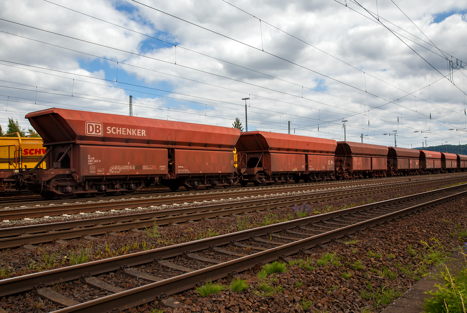 Hier nochmal nun am Zugschluss ein 2 x sechsachsige offene und kurzgekuppelte Drehgestell-Schüttgut-Wageneinheit für den Erztransport mit schlagartiger Schwerkraftentladung, hydraulischem Klappenverschlusssystem und automatischer Kupplung, 81 80 6861 508-1D-DB der Gattung Falrrs 152.2 der DB Cargo AG, am 18. Juni 2017, im Zugverband bei einer Zugdurchfahrt in Koblenz-Lützel in Richtung Norden (Köln).
