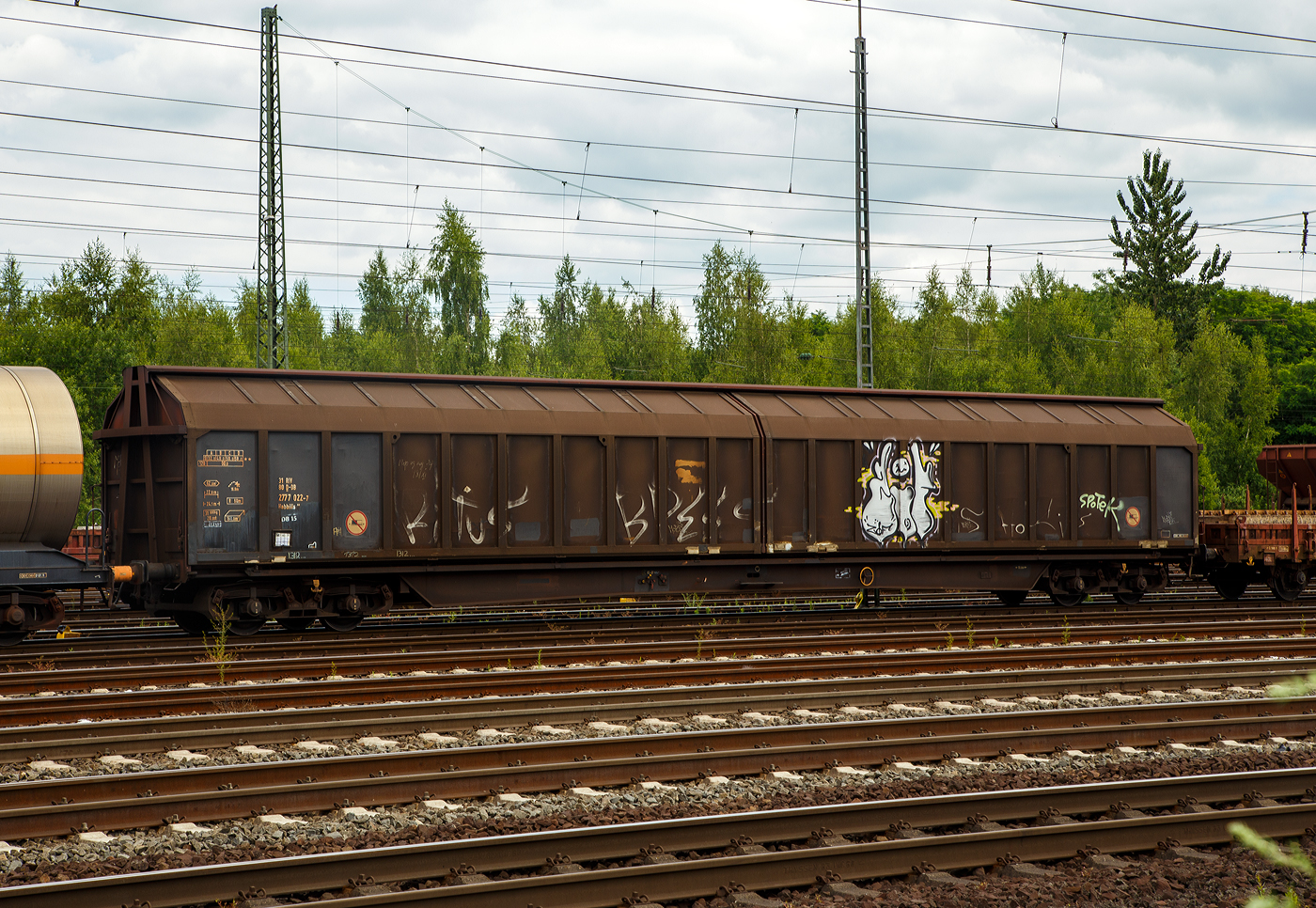 Zwei zweiachsige großräumige Schiebewandwagen (Gedeckter Wagen in Sonderbauart), vorne 21 80 2457 908-6 D-DB und dahinter 21 80 2458 653-5 D-DB, beide der Gattung Hbbillns 305 der DB Cargo AG, am 11 Juli 2025 im Zugverband bei einer Zugdurchfahrt in Rudersdorf (Kr. Siegen).