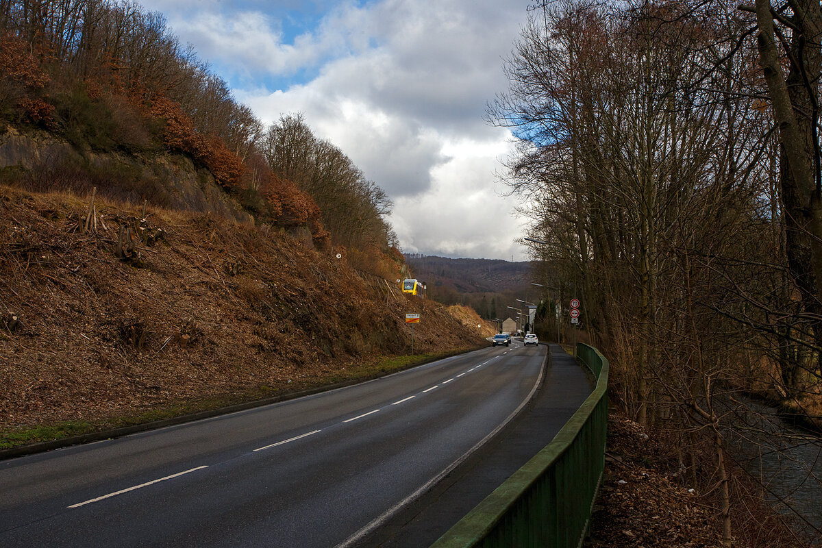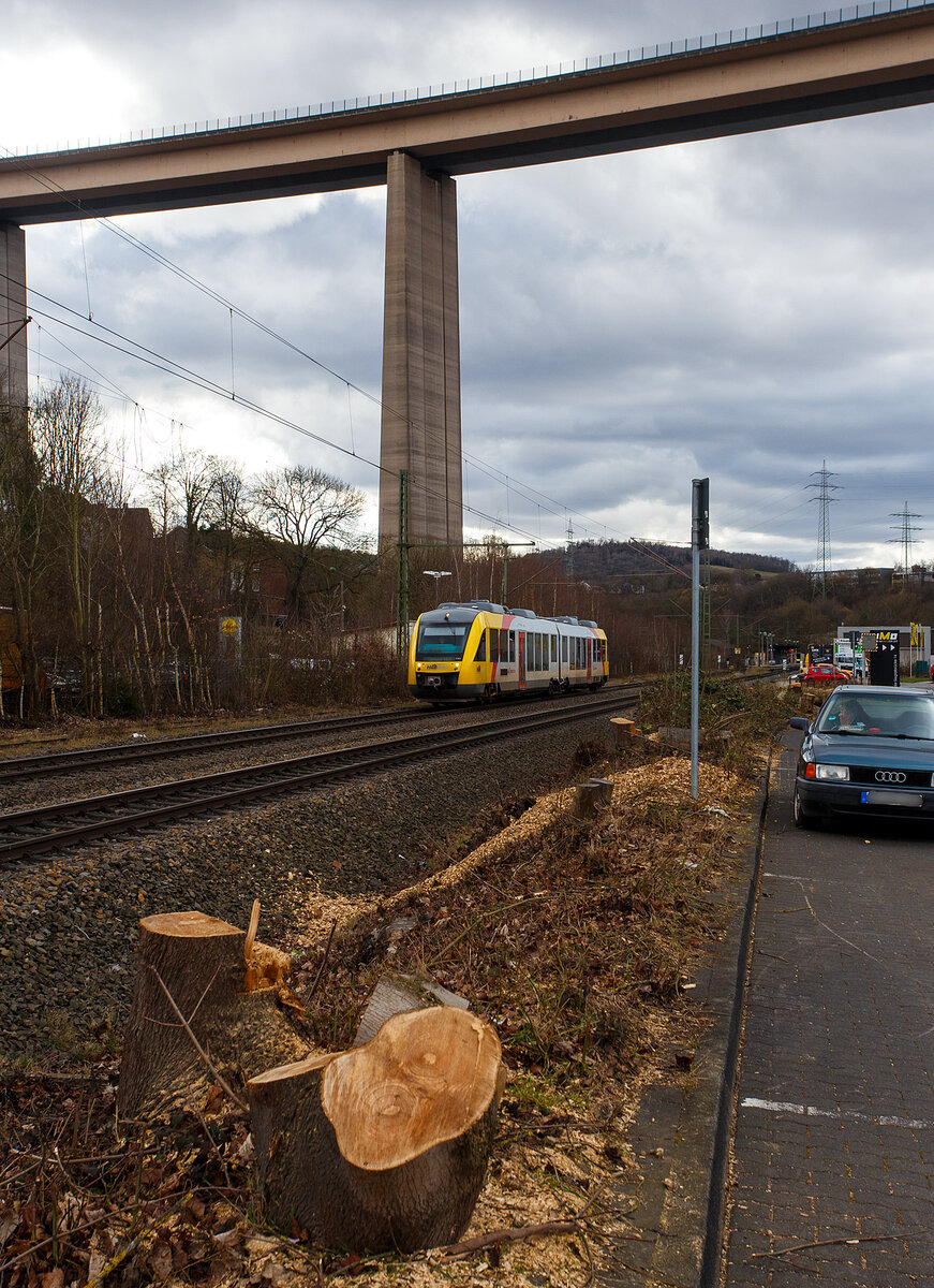 Der VT 254 (95 80 0648 154-2 D-HEB / 95 80 0648 654-1 D-HEB) ein Alstom Coradia LINT 41 der HLB (Hessische Landesbahn) fährt am 04.12.2016, als RB 90 "Oberwesterwaldbahn", von Scheuerfeld/Sieg weiter in Richtung Siegen, nächter Halt Betzdorf.