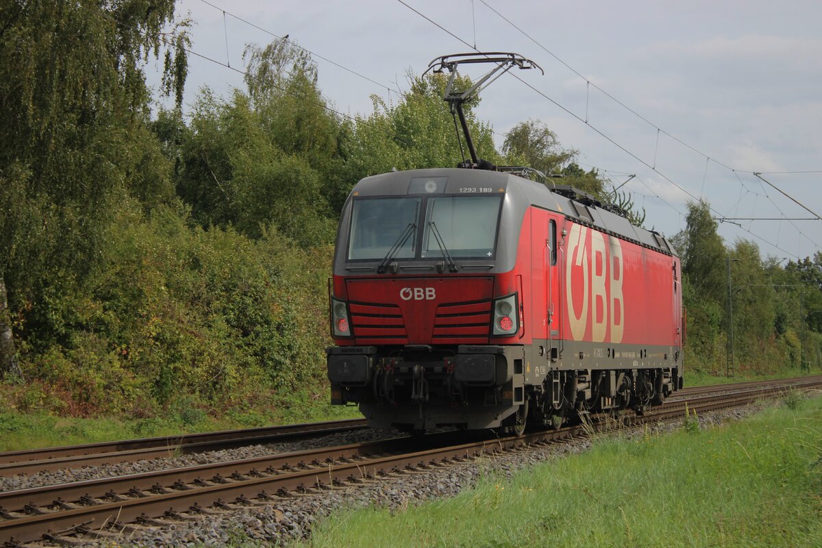 Am 8 Augustus 2025 wird ÖBB 1293 189 mit deren Kurzkesselwagenzug bei Kaarst vom offenbarer Weg fotografiert.