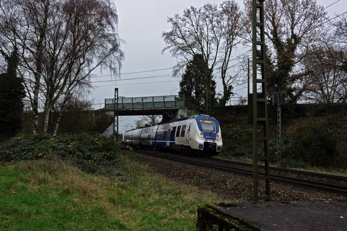 Nach einigen Unregelmäßigkeiten im Betriebsablauf tauchte im letzten Licht des 11.12.24 doch noch ein Zug der Linie RE7 auf, einige Fahrten vorher waren auf diesem Teilstück ausgefallen. Bei Meerbusch-Osterath hat 9442 369 und ein weiterer TALENT den Großteil des Laufwegs bereits hinter sich und wird in wenigen Minuten in Krefeld ankommen.