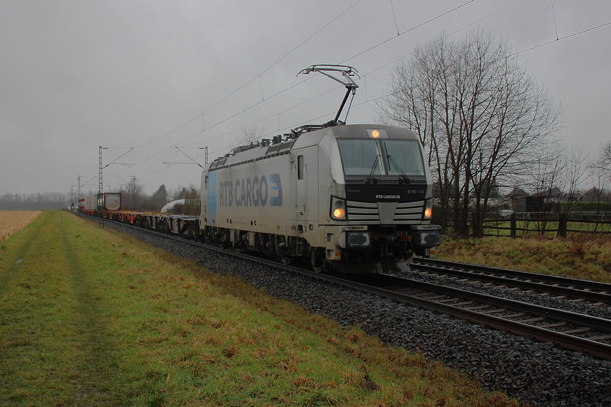 Die für die Rurtalbahn Cargo GmbH fahrende Vectron 193 824-0 "Düren" (91 80 6193 824-0 D-Rpool) der Railpool fährt am 22 Januar 2026 mit einem Kesselwagenzug durch Kirchen/Sieg in Richtung Siegen. Laut Gefahrgut- Warntafeln 30/1202 waren die Wagen mit Dieselkraftstoff oder leichtem Heizöl beladen.