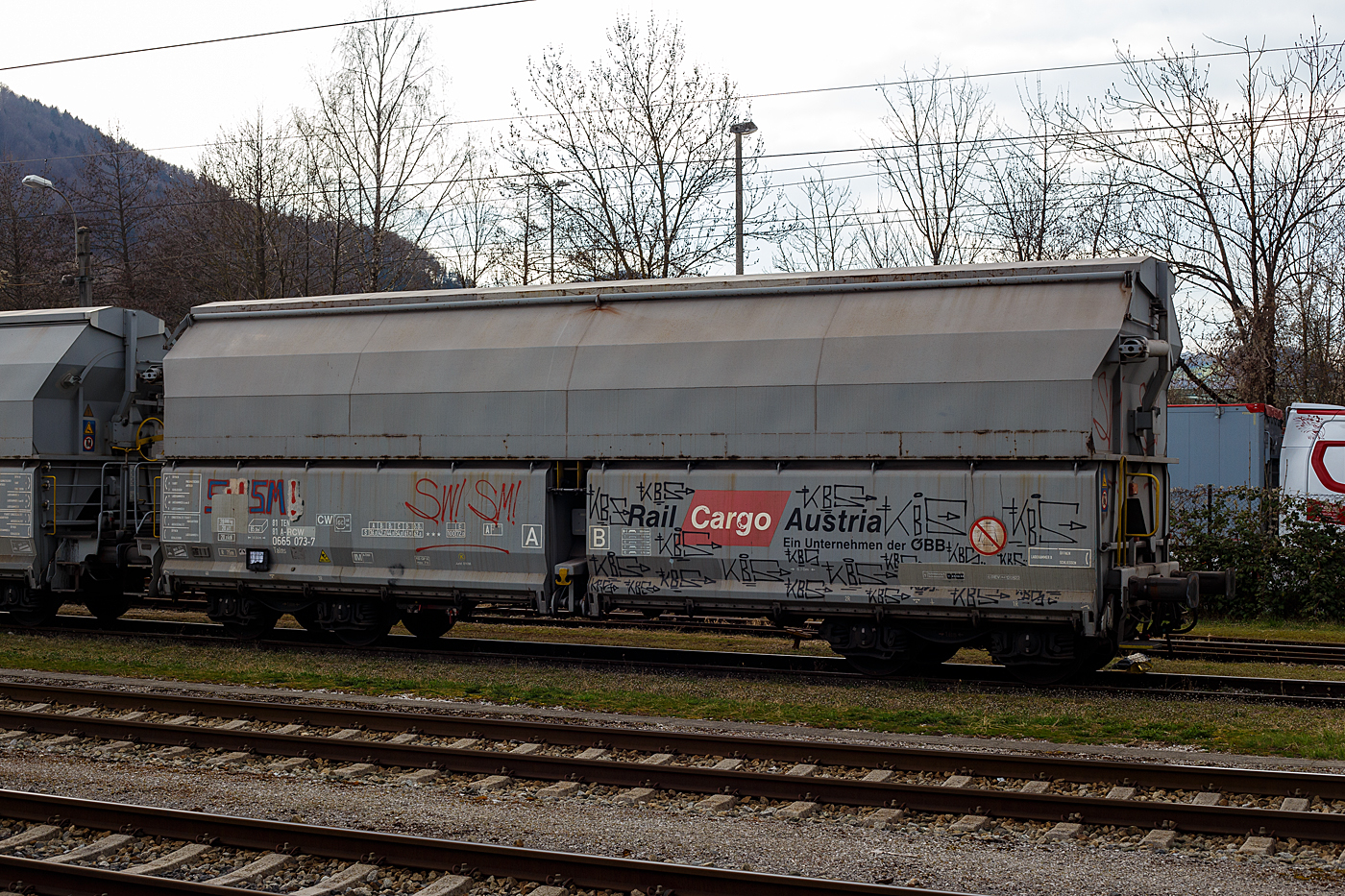 Gedeckter vierachsiger Drehgestell-78m³-Schüttgutwagen mit Schwenkdach und schlagartiger mittigen Schwerkraftentladung (Mittenselbstentladewagen) 33 80 0689 088-7 D-ORWU, der Gattung Tanoos, der Waggonvermietungsfirma On Rail GmbH (Mettman), abgestellt am 24.11.2022 im Bahnhof Schwandorf.