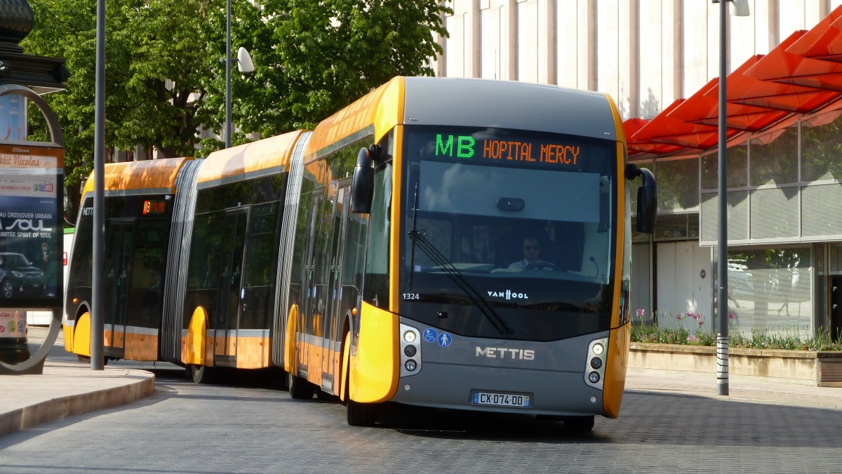 Frankreich, Lothringen, Metz, Place de la République. Die dreiteiligen diesel-elektrischen Hybridbusse METTIS werden von Van Hool auf der Basis der EquiCity Busse gebaut. Kapazität: 150 Passagiere, Länge: 23,820 m. 24.04.2014