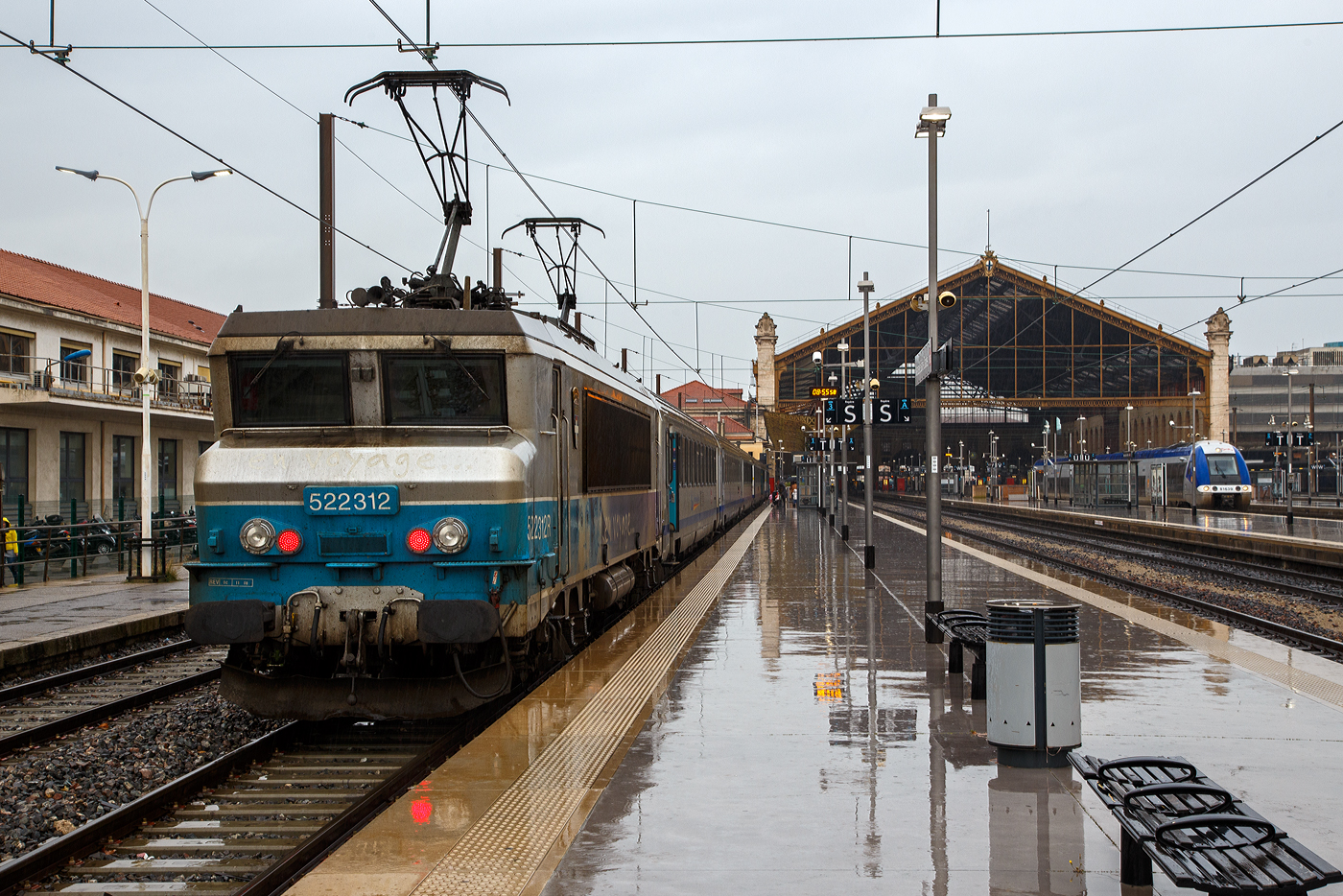 Der vierteilige BGC-Triebzug (AGC - autorail à grande capacité) der SNCF TER Provence-Alpes-Côte d'Azur (TER Zou !), B 81785 - B 81786 steht am 25 März 2015 im Bahnhof Marseille-Saint-Charles zur Abfahrt nach Aix-en-Provence bereit.