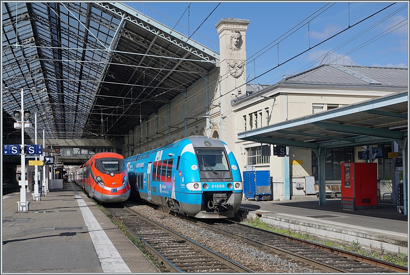 Der Trenitalia FS ETR 400 048 ist als FR 9291 von Paris Gare de Lyon nach Milano Centrale unterwegs und erreicht Chambéry-Challes-les-Eaux. Ich finde, bei Zügen im Ausland z.B ein SBB ETR in Österreich oder wie hierein FS ETR 440 in Frankreich, soll man sehen, dass der Zug sich in einem andern Umfeld befindet und dabei bot sich neben der schweren SNCF Gleichstromfahrleitung auch die markante Signalbrücke im Hintergrund an.