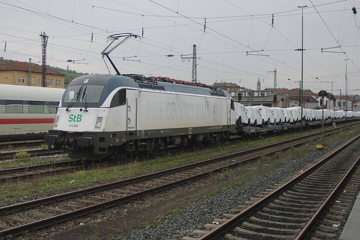 Leider hat StLB/Steiermarkbahn 1216.960 deren Aufkleber am Flanken verloren beim Passage durch Würzburg Hbf am grauen 30 September 2025.