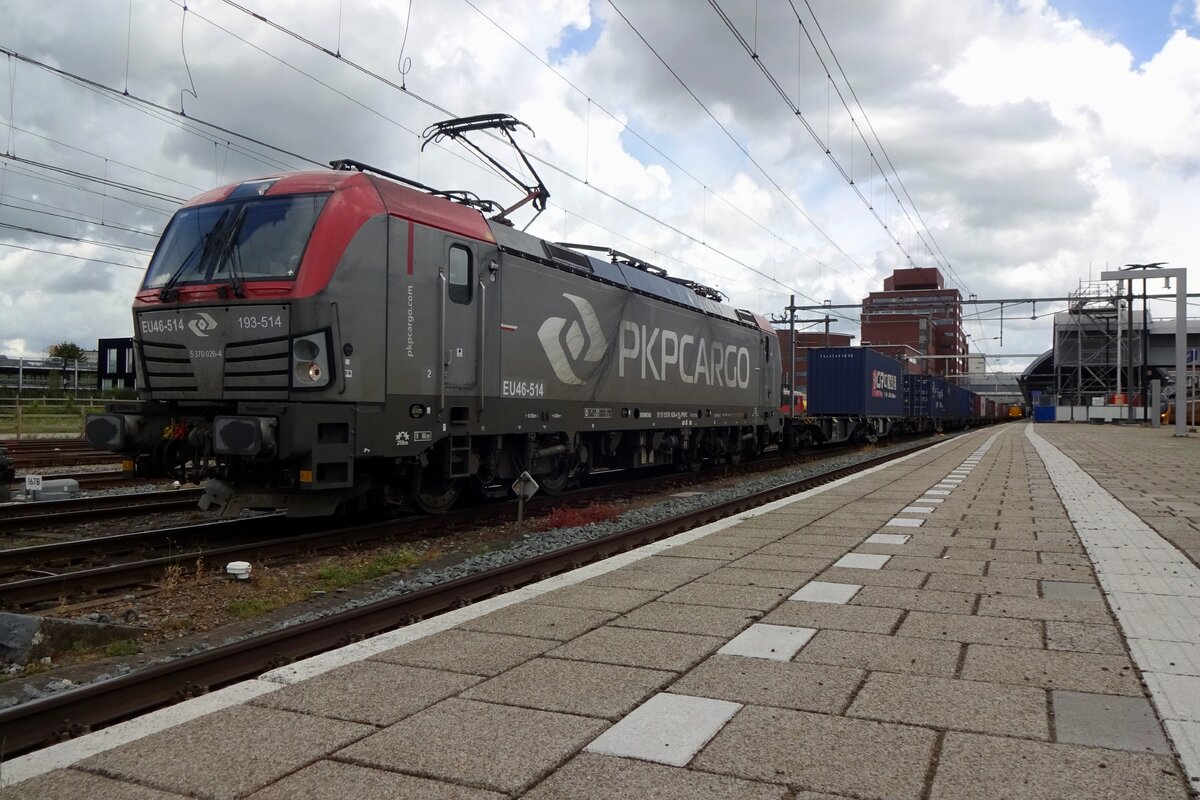 PKP Cargo EU46-513 -mit blau statt rosarote Kabinenlinien- schleppt ein Containerzug durch Wijchen am 29 Juli 2021.
