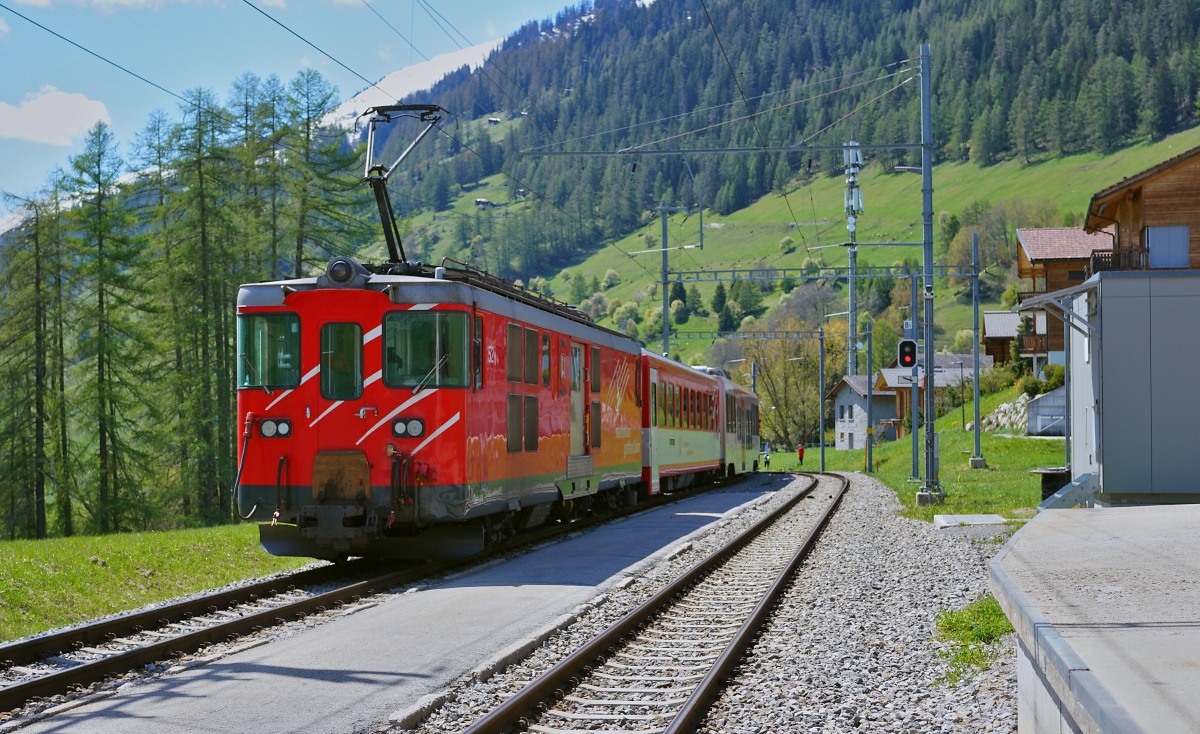 Am 11.05.2024 kommt Deh 4/4 II 95 mit einem Regio von Brig nach Andermatt in Lax an, im Hintergrund das 2951 m hohe Bättlihorn