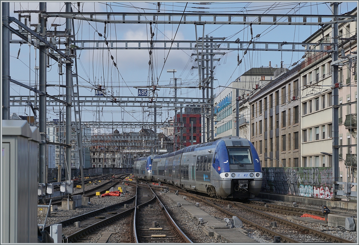 Der SNCF Z 27755 (nicht zu sehen an der Zugspitze) und der Z 27742 (am Schluss des Zuges) verlassen Genève als TER nach Lyon. Interessant ist auch ein Blick auf die Fahrleitung und den Schaltposten links im Bild - Während früher der Bahnhof in SBB Wechselstrom 15000 Volt, 16 2/3 Hertz und SNCF Gleichstrom (1500 Volt) Abschnitte geteilt war, können heutzutage etliche Gleise wahlweise mit der einen oder anderen Stromart gespeist werden, wobei der Vollständigkeit halber noch anzumerken ist, dass auf der SNCF Seite heute Wechsel- statt Geleichstrom eingespeist wird (25000 Volt 50 Hertz). 20. August 2024
