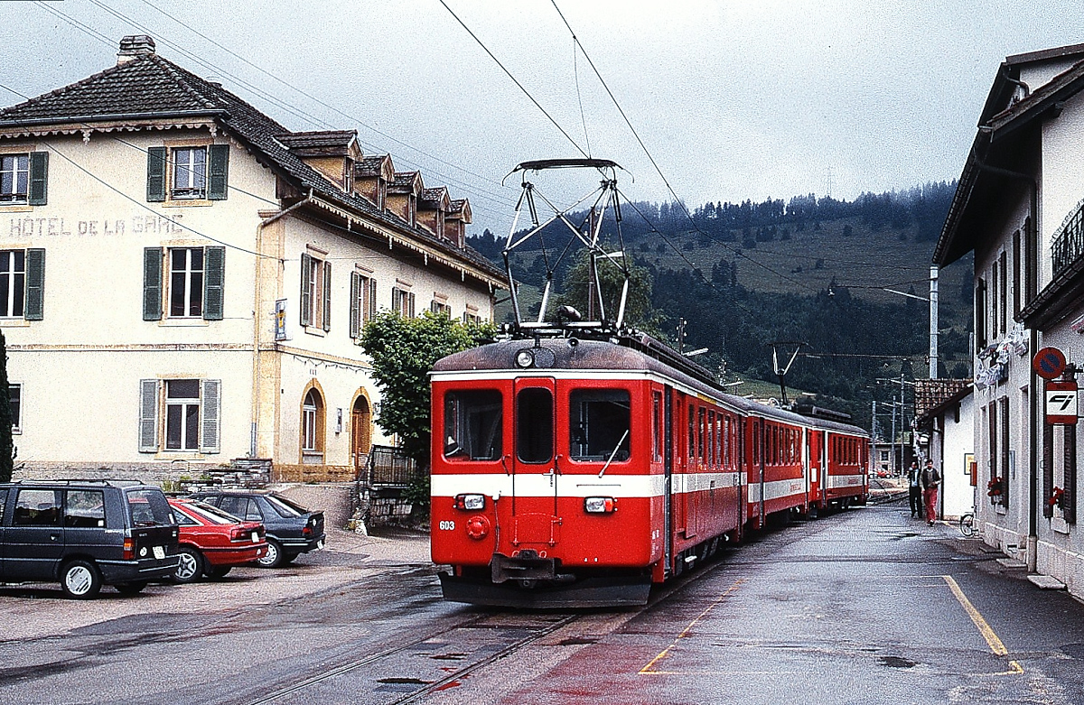 Im Sommer 1997 ist der BDe 4/4 II 613 mit einem Zug aus La-Chaux-de Fonds in Glovier angekommen. Zu diesem Zeitpunkt fanden anlässlich des 150-jährigen Jubiläums der schweizer Eisenbahnen Dampfsonderfahrten sowohl auf der SBB-Strecke nach Delemont als auch auf der CJ statt, die Parkplätze dürften sonst nicht so gut gefüllt gewesen sein.