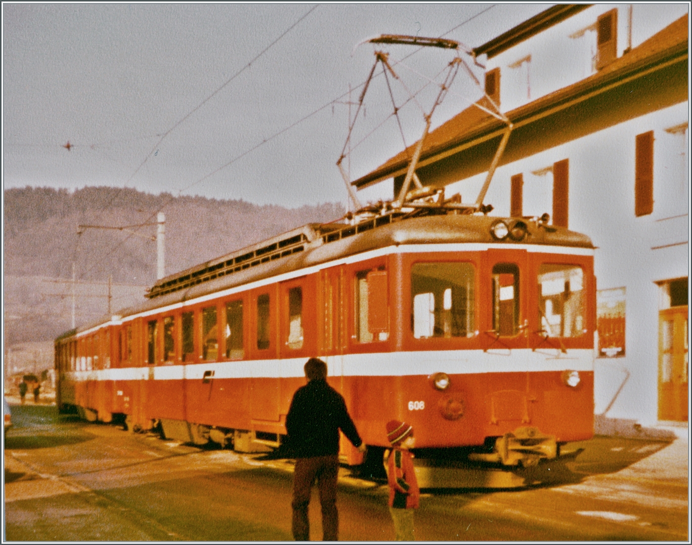 Die Strecke von Saignelégier nach Glovelier führt im ohnehin nicht gerade üppig bevölkerten Jura durch eine einsame Landschaft. Folglich war während einiger Jahre die Zugsdichte auf dieser Strecke sehr schwach. Eine CJ Meterspur Neubaustrecke von Delémont nach Glovelier hätte wohl das Problem etwas gelindert, fiel jedoch bei einer Volksabstimmung durch, immerhin wird heute (beim hochladen des Bildes 18.1.26) die Strecke im Stundentakt bedient. Der lange Worte kurzer Sinn: Der Endhaltepunkt der CJ-Züge war direkt vor dem SBB Bahnhof Glovelier mitten auf der Strasse, wie dies Bild des CJ BDe 4/4 606 mit Bt zeigt. Analogbild vom 16. Jan. 1982