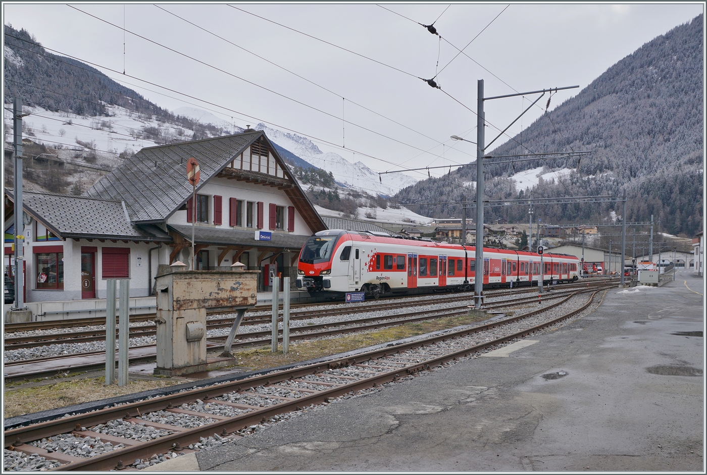 In Orsières wartet als herrlicher Kontrast zur Gleiswaage im Vordergrund des Bildes der TMR Region Alpes RABe 533 601 (UIC Nummer RABe 94 85 0 533 701-4 CH-RA) mit dem Wappen "Commune de St Léonard" und dem dazu passenden Namen "La Souterraine" als R82 26325 auf die Abfahrt nach Sembrancher.