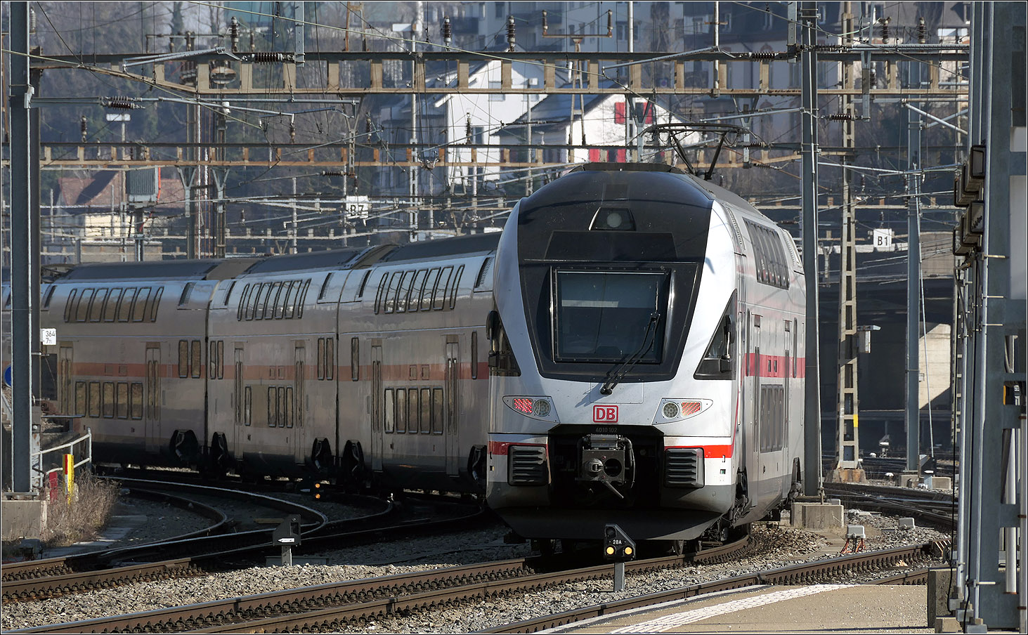 Auf Motivsuche mit Olli in Schaffhausen - Der IC Stuttgart - Zürich verlässt den Bahnhof Schaffhausen in Richtung Zürich. Der hintere Steuerwagen scheint sich etwas nach außen zu neigen, da der Gleisbogen im Vorfeld vermutlich keine Gleisüberhöhung hat. 09.03.2025