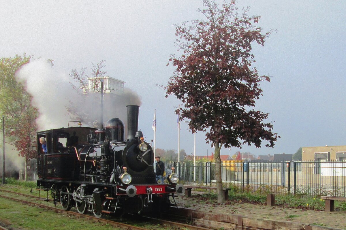 Museumbuurtsporweg MBS 7853 lauft am 23 Oktober 2016 um in Haaksbergen. In 1945 kauften die Niederländische Staatseisenbahnen zwei ex-JS, ex-SBB Tigerli (8438 und 8439). In 1948 wurden die beide Dampfloks ausgemüstert. In 1910 wurde ein Tigerli für Alusuisse gebaut und in 1996 von die MBS gekauft. Weil es kein Originallok war wurde die jetzt Niederländische Tigerli (auch Navizence genannt) als 7853 eingereiht und ist heute betriebsfähig, wie sie hier in Haaksbergen unter Beweis stellte.