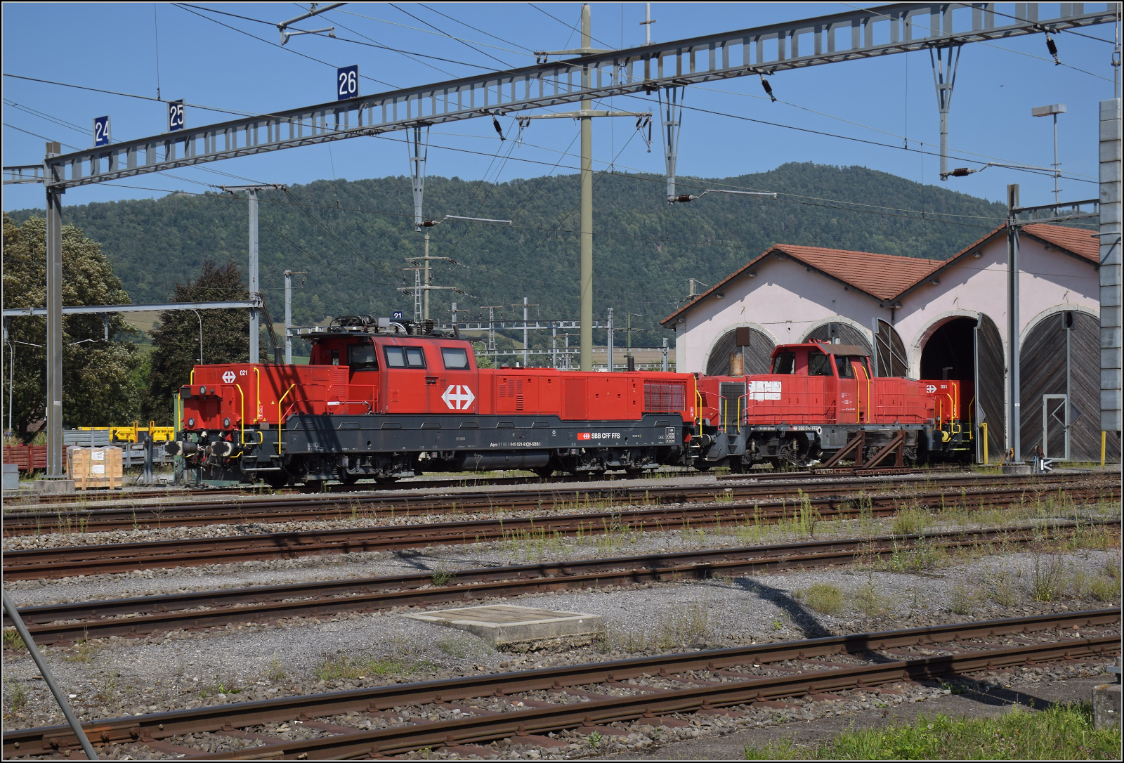 Aem 940 021, Am 841 029 und in den Lokschuppen passt die lange Aem 940 051 nicht ganz hinein. Delémont, August 2024.