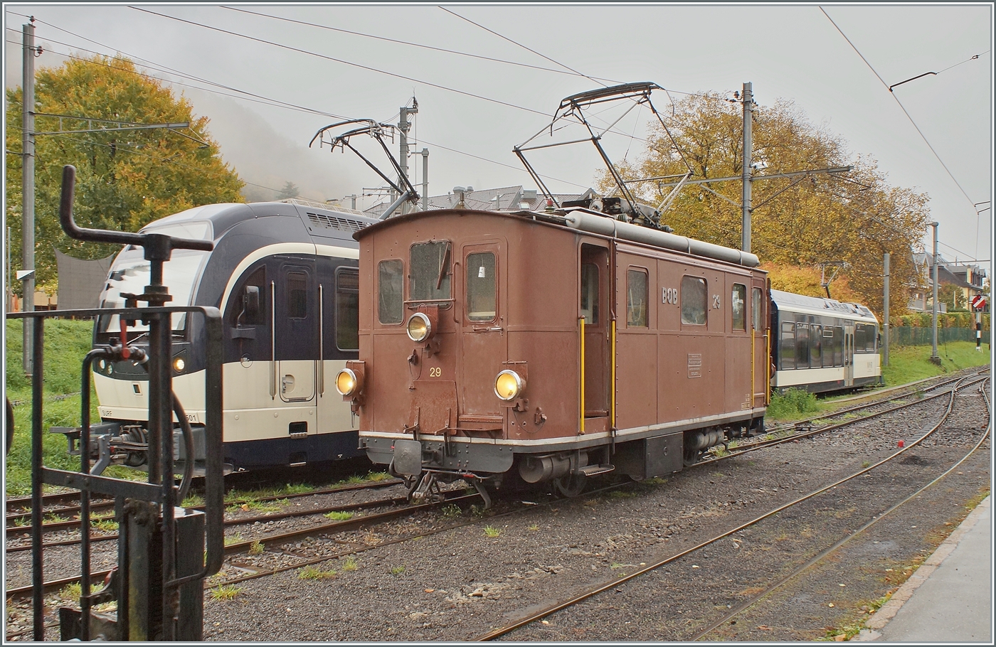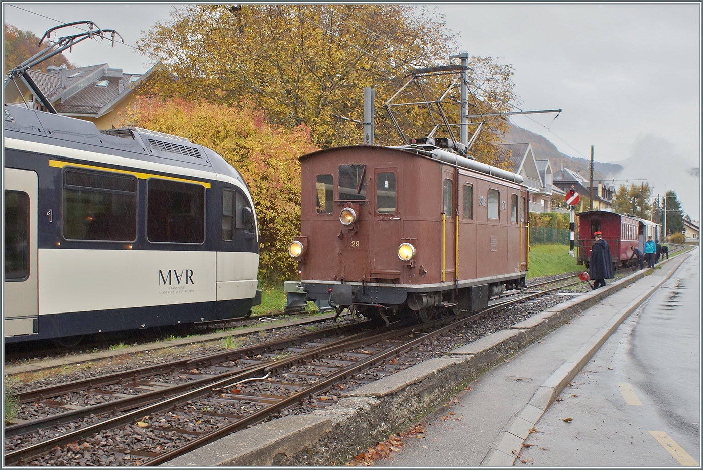 La DER de la Saison / Das Saison Ende der Blonay Chamby Bahn 2025 - Seit einigen Jahren zeigt die Blonay Chamby Bahn zum Saison Ende mit einem verdichteten Fahrplan noch einmal ihre herrlichen Fahrzeuge im Einsatz: Die BOB HGe 3/3 29 N° 29 der Blonay Chamby Bahn ragniert in Blonay für die Rückleistung ihres Zugs nach Chaulin (der im Hintergrund zu sehen ist.). 25. OKt. 2025